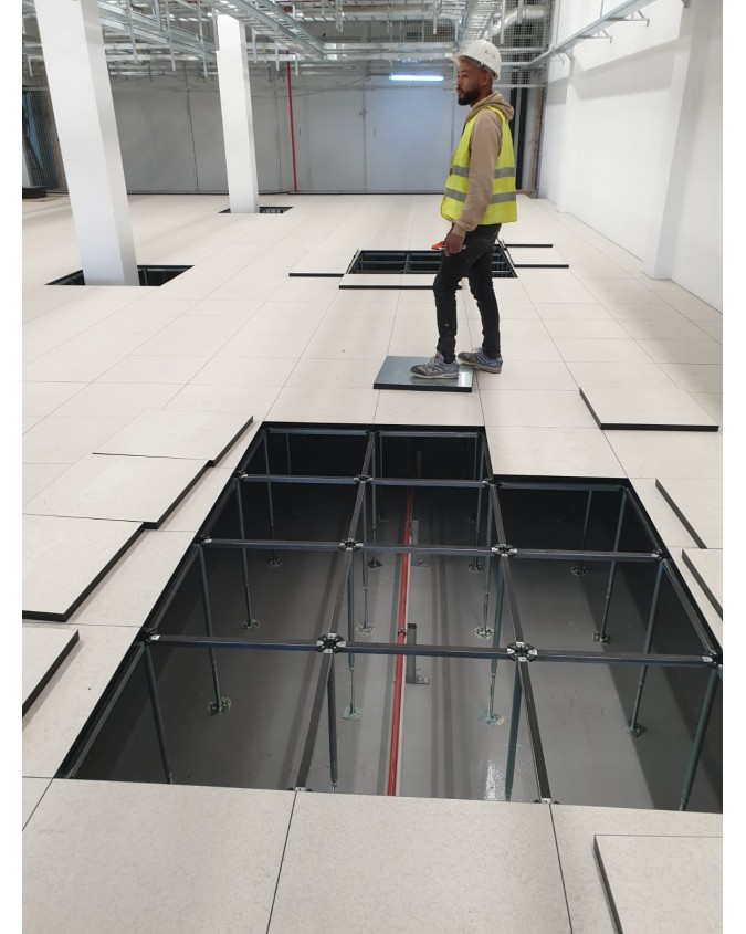 Le plancher technique aggloméré en sulfate de calcium à haute résistance d'intérieur. Il nous permettra d’effectuer toutes les installations de voix et de données sous le plancher enregistrable et nous pourrons y accéder à tout moment pour effectuer des extensions ou des modifications.