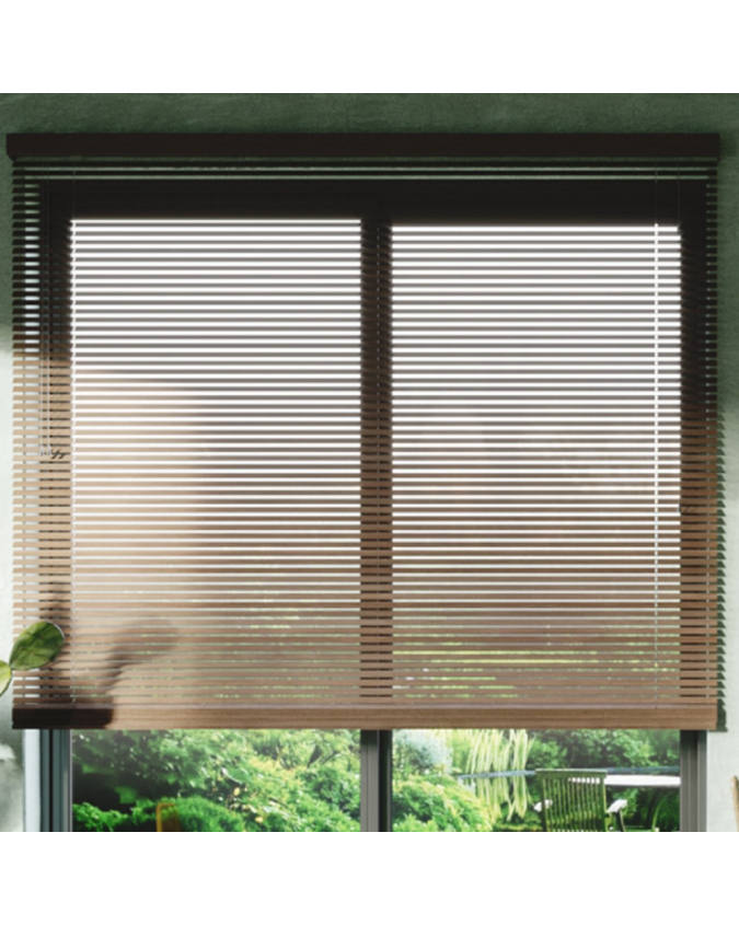 Le rideau vénitien / horizontal sur-mesure composé de lamelles horizontales en bois.