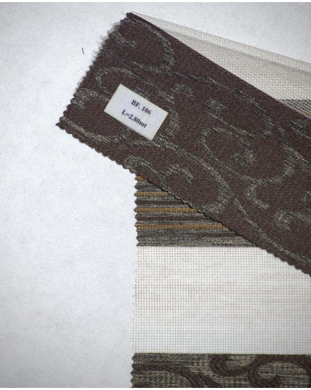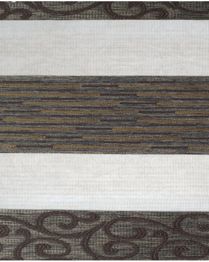 Le rideau enrouleur double jeu / Zebra sur-mesure composés de bandes horizontales intercalant un tissu transparent et un tissu semi-opaque qui se superposent lorsqu’ils sont actionnés.